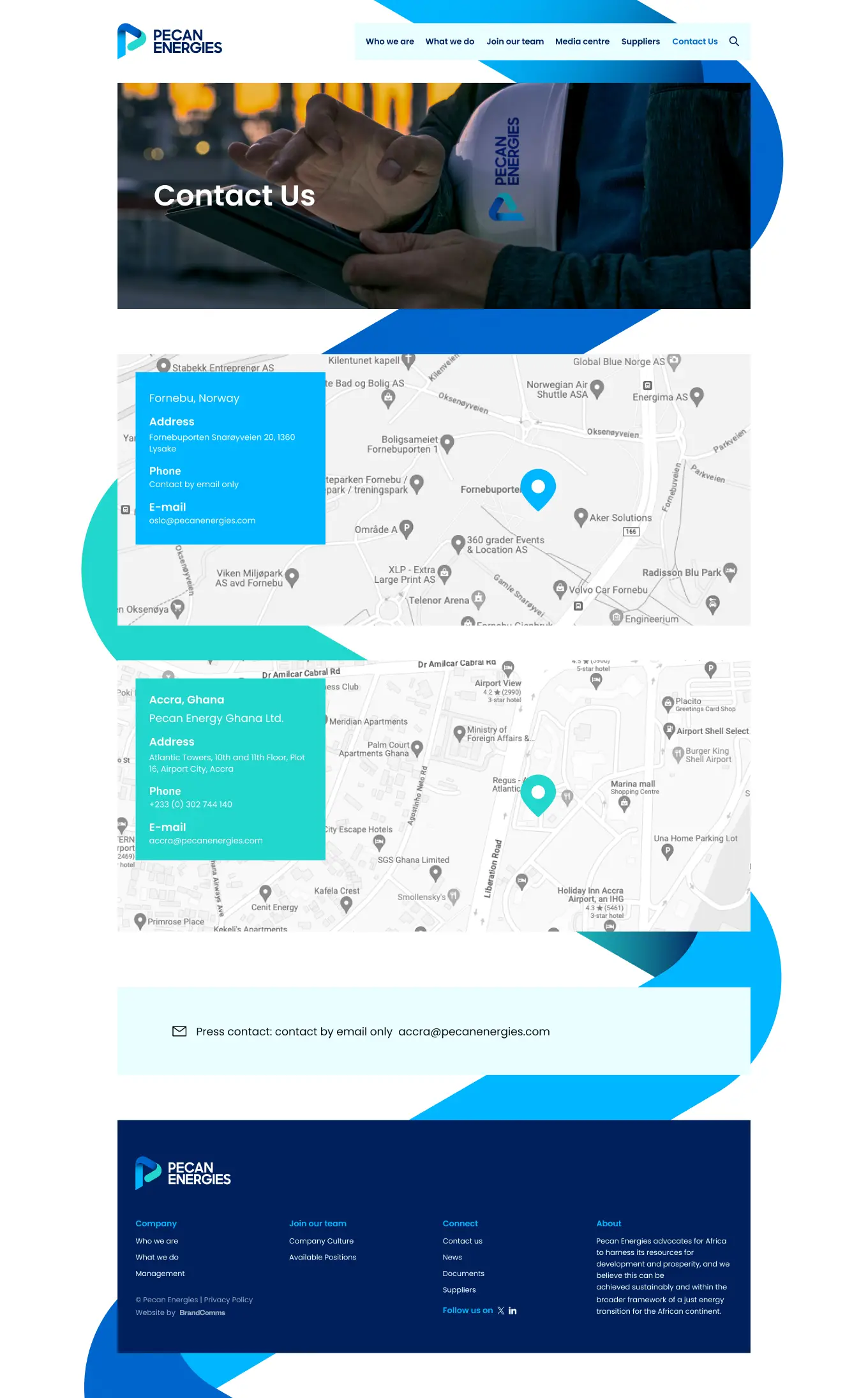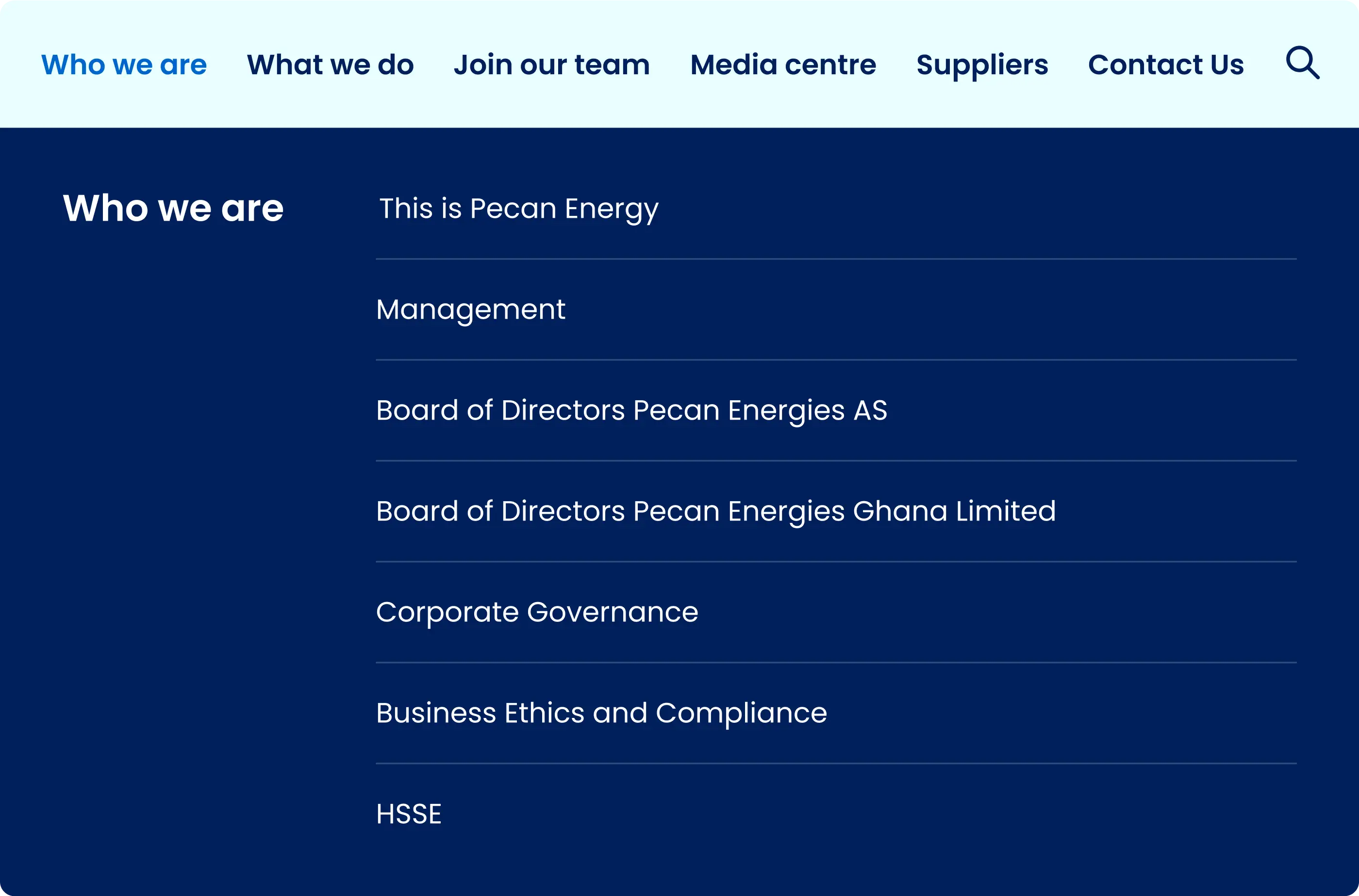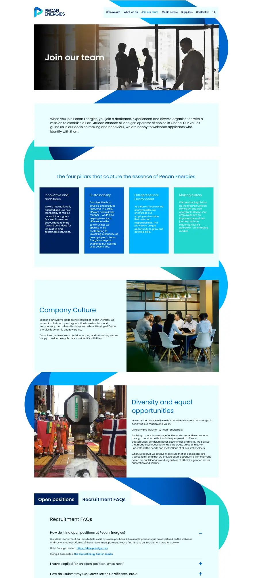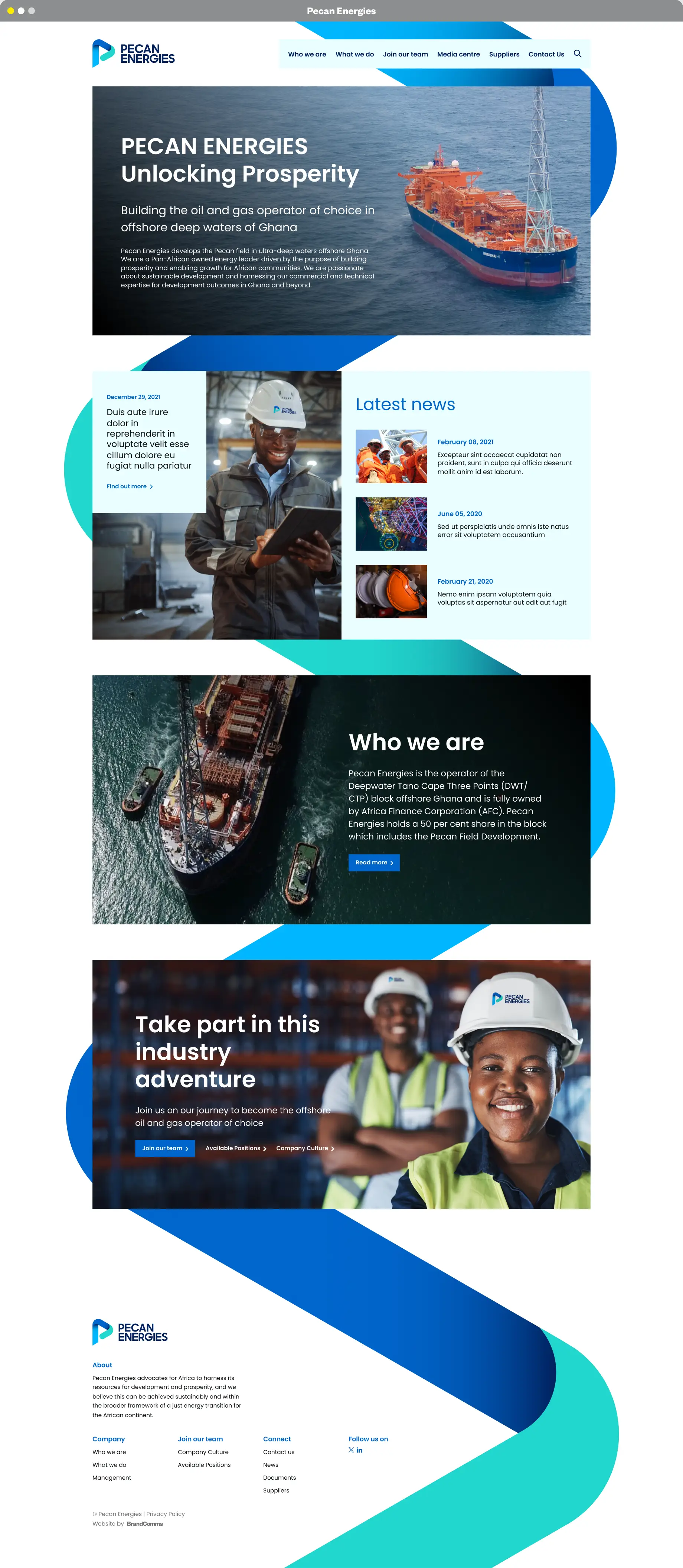 As operator of the Deepwater Tano Cape Three Points (DWT/CTP) block offshore Ghana, Pecan Energies sought a modern website to anchor their rebrand. With a focus on sustainable resource development, ESG leadership, and a just energy transition, the platform needed to explain deep-water development milestones, showcase community initiatives like Pecan Inspire scholarships, and build trust with stakeholders from regulators to local communities.